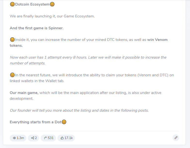 Dotcoin DTC — стабильно растущий проект. Разработчики реализовали тапалку, в которой есть заработок поинтов Доткоин, а также майнинг DTC, доступный только для верифицированных пользователей. Помимо этого можно приглашать друзей, выполнять задания и прокачивать аккаунт. Есть кланы, бусты и даже мини игры с возможностью выиграть TON и другие призы. О том, кто создал Dotcoin, информации нет, команда анонимна, а посты в Дот Коин ТГ подписаны “владелец Доткоин”. Первоначальный план разработчиков включал листинг токена на блокчейне Тон, однако из-за большого количества сбоев и задержек с транзакциями было принято решение перейти на блокчейн Веном. Деталей токеномики в канале нет, в дорожной карте указаны только этапы развития проекта Dotcoin ton без привязки к точным датам.