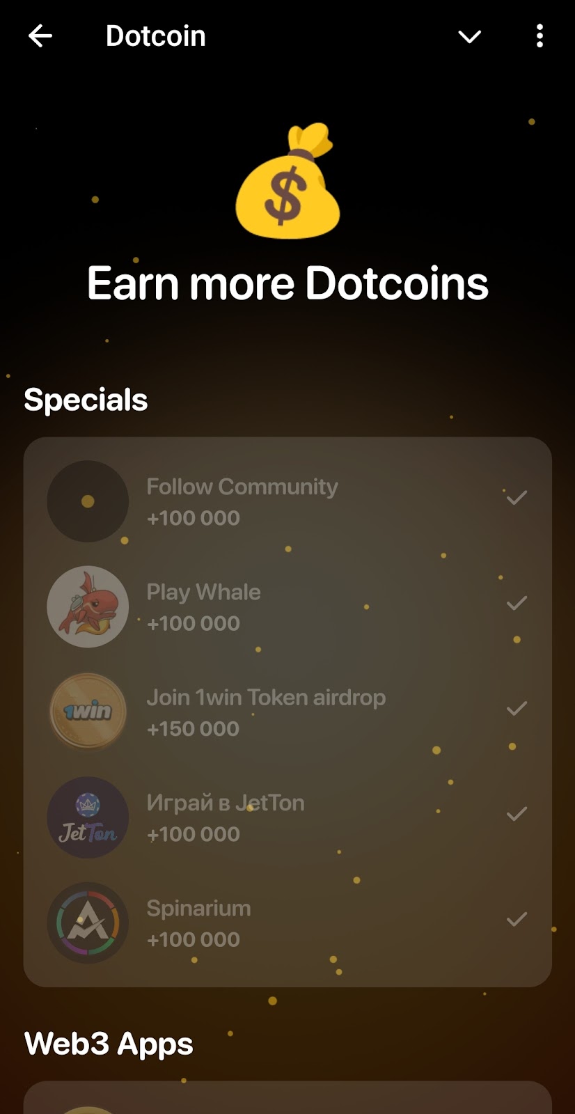 Dotcoin можно набить в заданиях, за рефералов и в кликере. А DTC — выиграть в Спиннере или намайнить.
