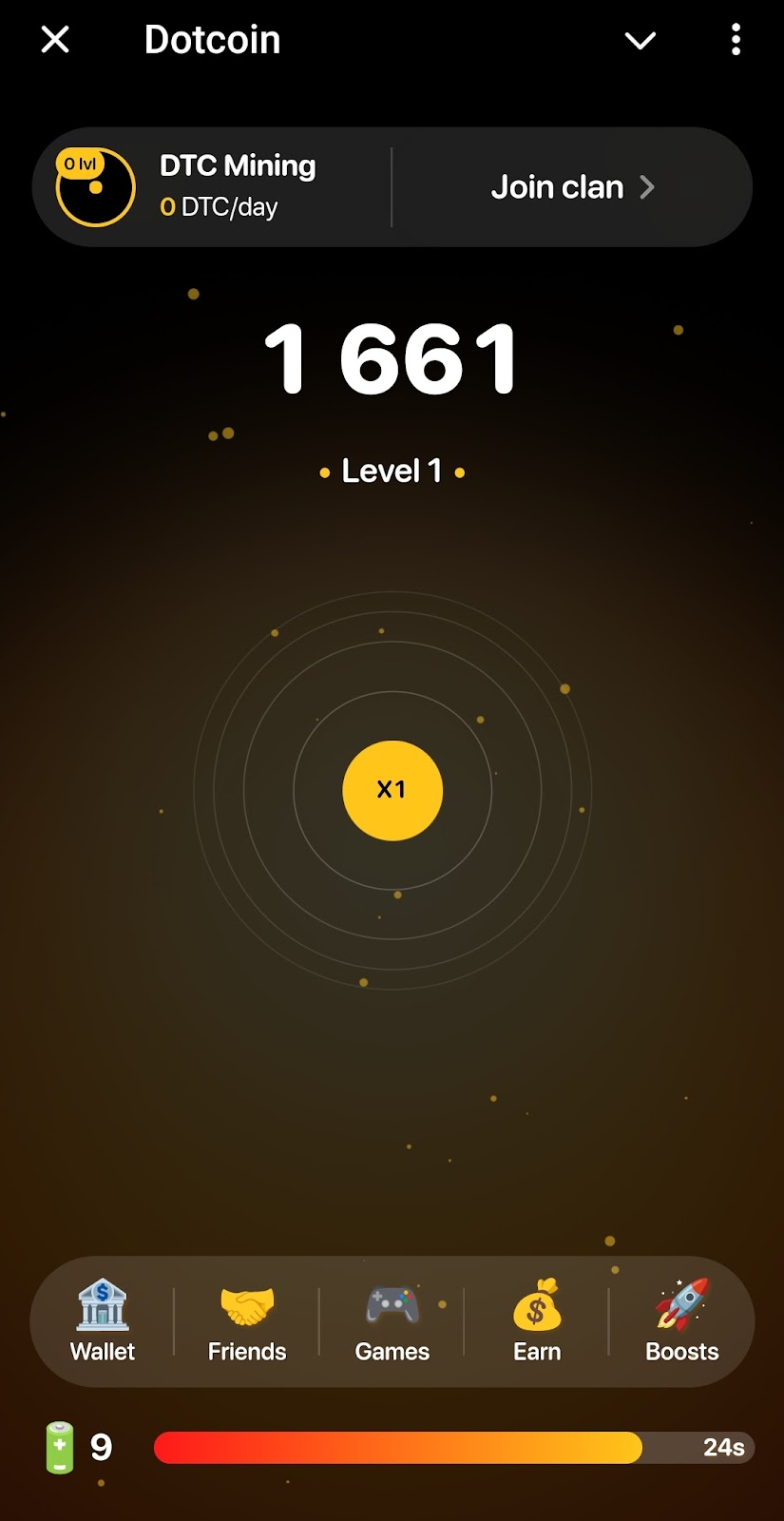 На главном экране Dotcoin tg пользователю доступна информация о количестве пассивной добычи в день токенов DTC, есть выбор кланов. А также можно тапать для получения монет Dotcoin. Добыча в кликере доступна 10 раз, потом энергии нужно время на восстановление. Игра длится 20 секунд, сначала юзер тапает по малому кругу и выбивает 1 поинт за клик. Потом переходит на второй круг — 2 поинта за тап, и так до 4 круга. В последнем нужно успеть набить как можно большее количество фишек с максимальным мультипликатором.