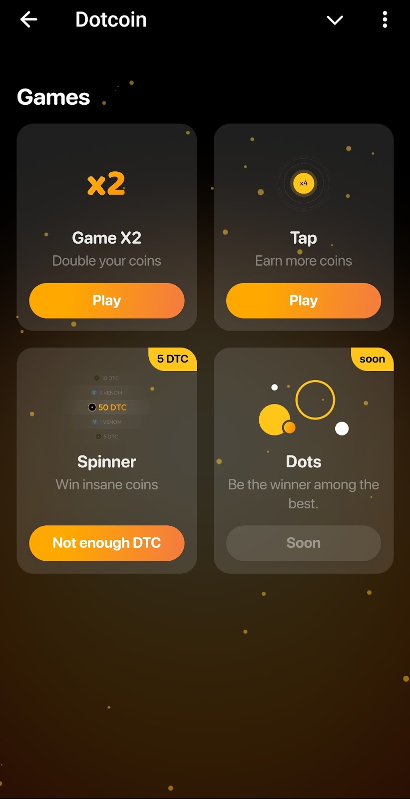 Игры в тапалке Доткоин дают дополнительный доход, можно даже выиграть TON или Venoms. Игра х2 — раз в сутки можно испытать удачу и получить до 500 тысяч Доткоинов. Вероятность выпадения не более 51%, хотя раньше все новички получали этот бонус с 95%. В Спиннере можно выбить денежные призы, но это большая редкость, у игроков есть одна попытка каждые 8 часов. Разработчики обещают дополнять игровой контент.