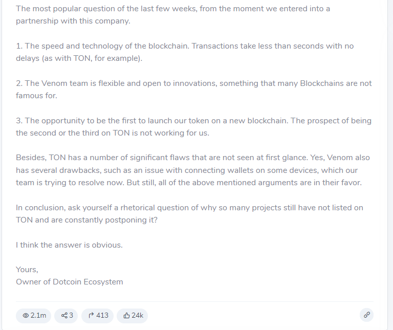 Последние новости Dotcoin освещают смену блокчейна для чеканки DTC coin. Изначально разработчики рассматривали возможность выпуска Dotcoin ton, но после сложностей в блокчейне, проблем с валидаторами и прочих трудностях TON было решено рассмотреть альтернативные варианты. В итоге крипта DTC будет отчеканена на Venom. А сам токен должен стать утилитой для развития DotcoinNetwork и основной игры, старт которой обещают в обозримом будущем.