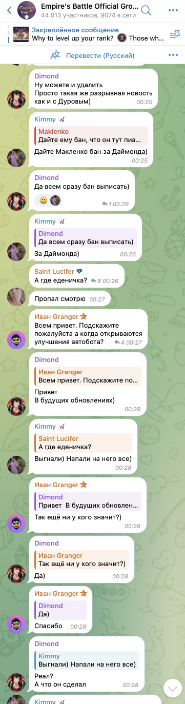 Однако с чатом тоже наблюдаются определенные странности. Так, этот телеграмм-аккаунт Empires Battle позиционируется как международное сообщество. Однако общение в нем ведется почему-то исключительно на русском языке.