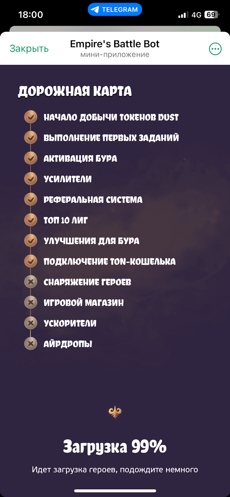 Процесс загрузки тапалки «Эмпаерс Батл» занимает некоторое время. Поэтому разработчики игры Empires Battles на лоадскрине разместили дорожную карту проекта. Из нее, в свою очередь, следует, что данный проект планирует стать масштабной GameFi-экосистемой.