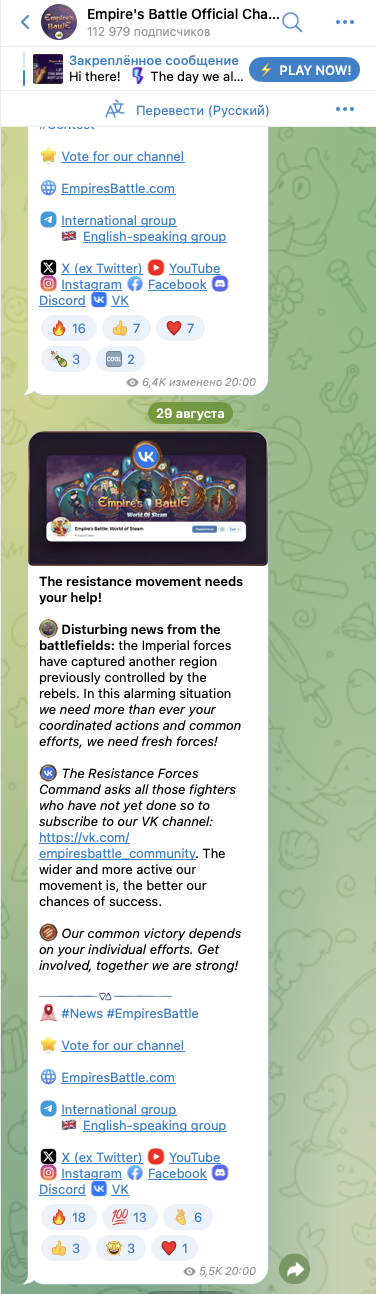 Официальный телеграм-канал Empires Battle – Empire’s Battle Official Channel. На него, на 13 сентября 2024-го года, подписано около 113 тысяч пользователей.