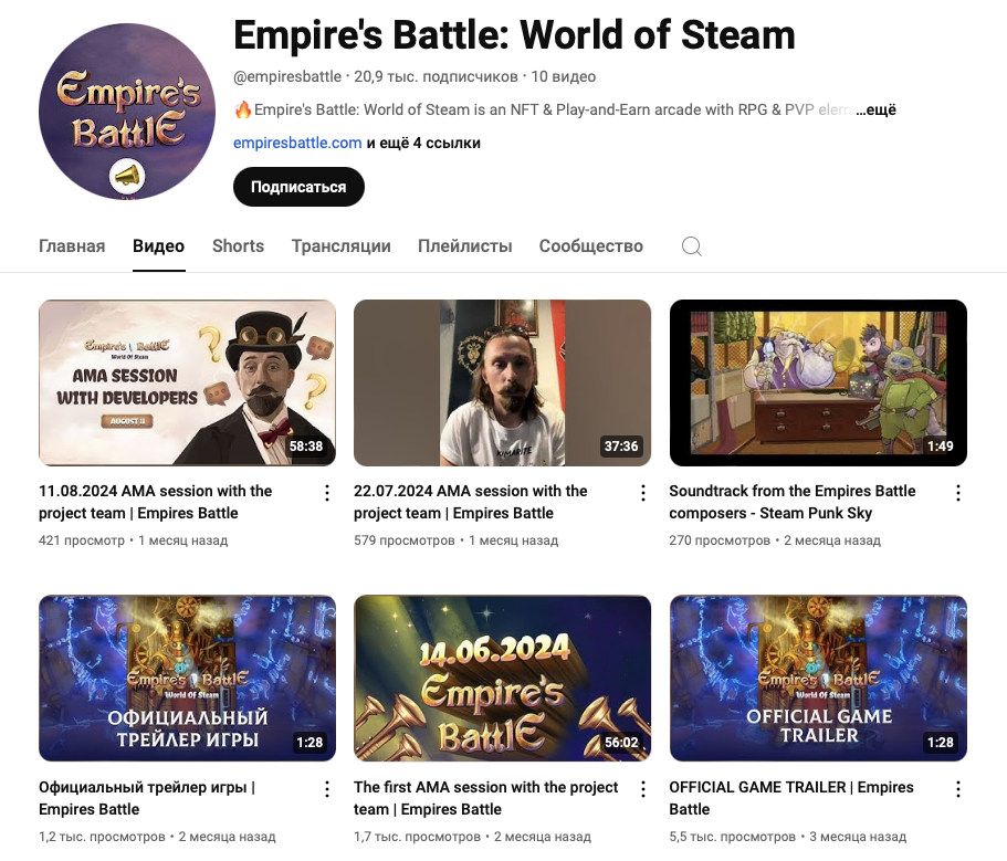 На YouTube-канале проекта EmpiresBattle ситуация не лучше. Так, при 21 тысячи подписчиков выложенные около месяца назад ролики просмотрели менее полутысячи раз.