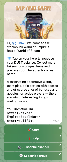 Новичкам, не знакомым с кликерами, в первую очередь нужно узнать следующее: Empires Battle запускается через телеграмм-бота – EmpiresBattleBot. После его запуска появляется сообщение с приветствием. А под ним, в свою очередь, находится кнопка Start.