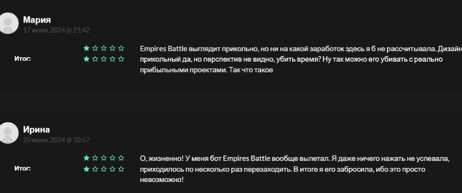 Отзывы о Empires Battle в интернете, преимущественно, негативные, однозвездочные. Люди не верят в возможность заработка в соответствующем приложении.