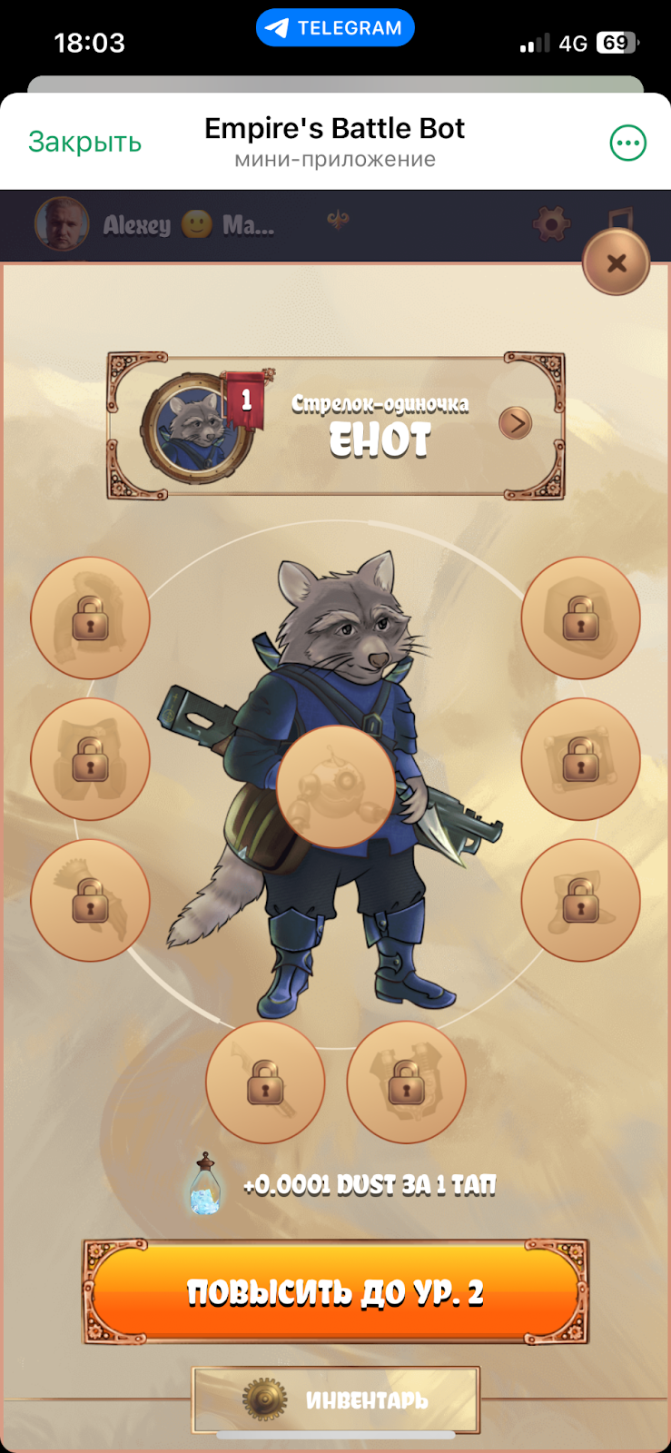 Empires Battle – красочная игра-тапалка в Telegram. В ней предлагается тапать на енота, чтобы затем приобретать для него различные улучшения.