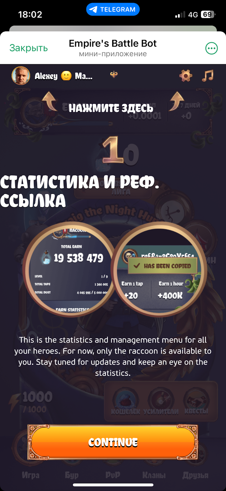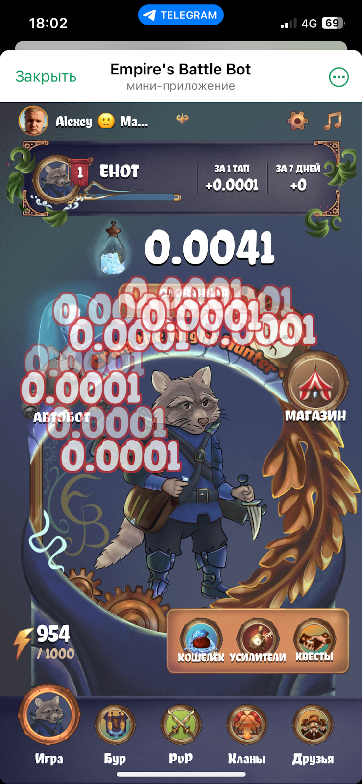 В целом, в текущем виде Empire s Battle Bot сейчас представляет классический кликер. На главном экране нужно нажимать на изображение енота. Кликать можно сразу несколькими пальцами.