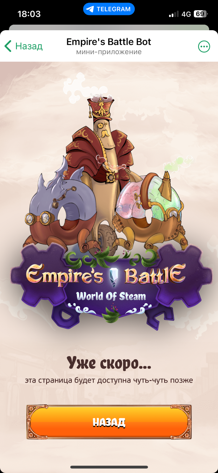 В результате нажатия на Start в «Эмпаерс Батл Бот» начинает загружаться мини-приложение. Однако если сделать это с компьютера, система продемонстрирует заглушку. В ней будет QR-код и предложение зайти в игру со смартфона.
