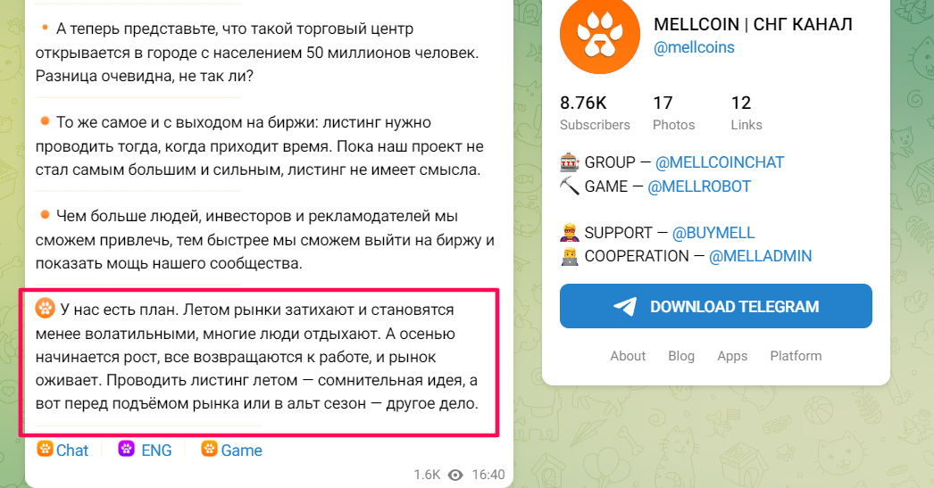 Последний пост в канале вышел 13 июля 2024 года. Он был о партнерстве с Architec.ton. В новостях Меллкоин есть пост о том, что до осени команда не видит смысла проводить листинг. Никаких деталей о дальнейшем развитии проекта в MELLCOIN MELL COIN не публиковалось.