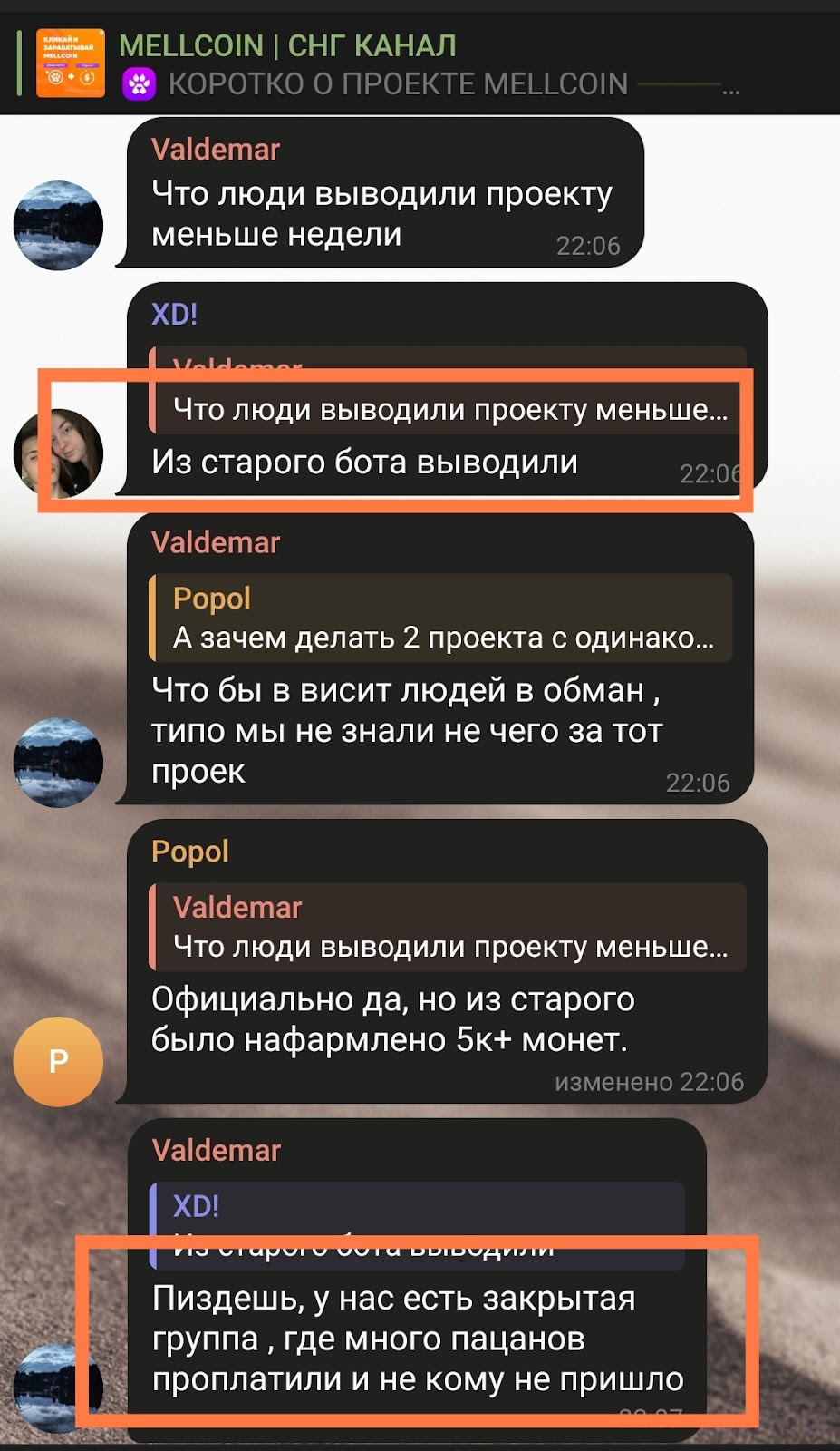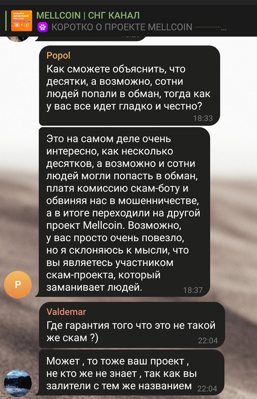 Заработок в Mellcoin — фантастика. Это стандартная пирамида, но только в качестве инвестиций не обязательно вкладывать деньги, достаточно тратить свое время и активно приглашать людей. Коммерческая составляющая тоже есть, иначе бы организаторам этого скама было не выгодно пиарить его. Редакция не рекомендует подобные проекты. В отзывах о кошельке Mellcoin много жалоб на невозможность обмена токенов. В комментариях в СНГ канале можно прочитать много сообщений, которые дают представление о мошенничестве в проекте.