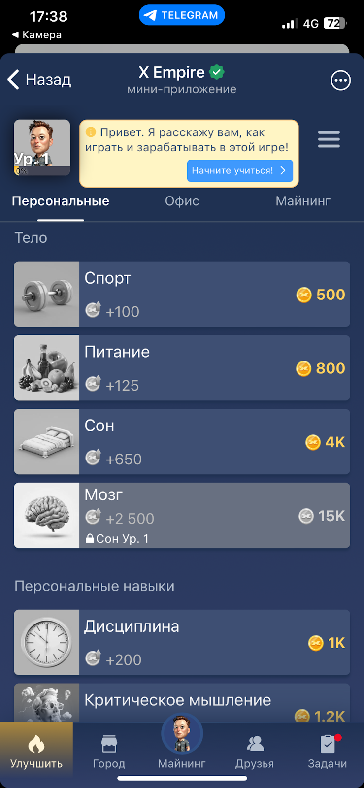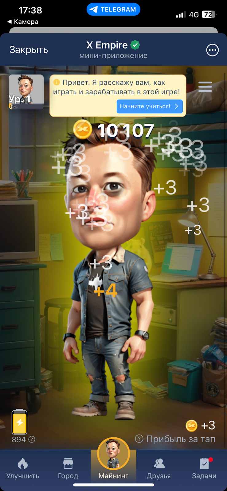 Люди, знакомые с тапалками, быстро поймут, что это за проект Musk Empire. Новичкам же следует знать, что данное мини-приложение – кликер, в котором предлагается зарабатывать крипту путем многократных нажатий на экран и последующей прокачки аккаунта.