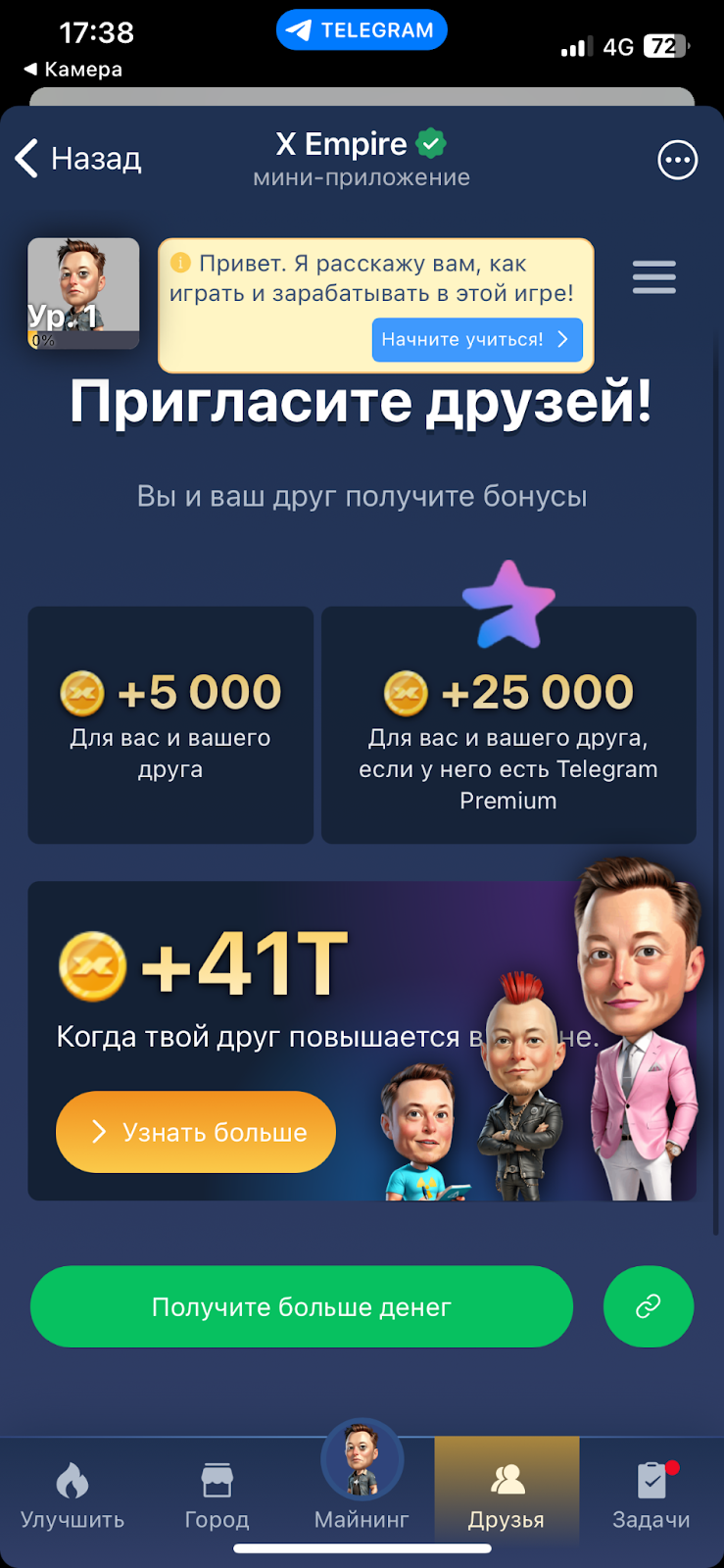 И, конечно, в MuskEmpire Bot Game есть реферальная система. В соответствии с ней, за каждого приглашенного друга дается от 5 до 25 тысяч монет. А если реферал повысит в игре свое звание, то пригласившему его моментально будет выплачена огромная сумма.