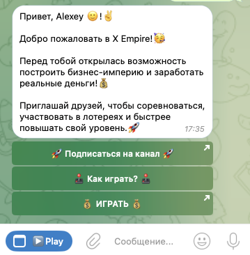 Чтобы начать майнить криптовалюту в игре-кликере «Маск Эмпайр», вначале нужно зайти в телеграм-бот Musk Empire – musempire bot. После его активации в чат поступит сообщение с приветствием.