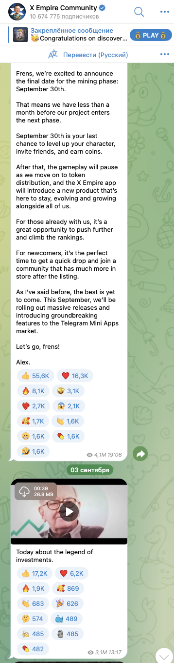На телеграмм-канал проекта Musk Empire – X Empire Community, muskempire, на 6 сентября 2024-го года, подписано свыше 10 миллионов пользователей. При этом, публикации, в среднем, просматриваются 4-5 миллионов раз. А это, в свою очередь, показывает, что проект «Маск Эмпаер» привлек очень много внимания.