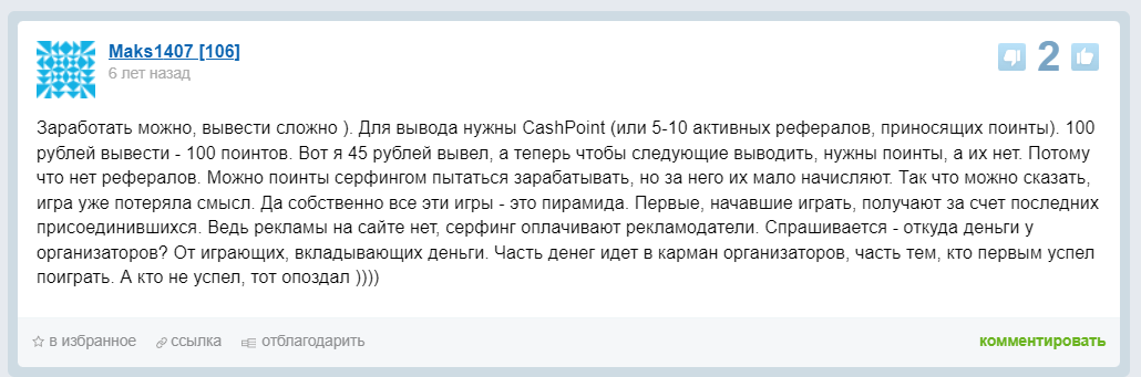 Поговорим о том, как вывести средства на сайте Онлайн Огород ком. Это непростой процесс, так как для вывода нужно иметь CashPoint. Это поинты, которые дают за серфинг сайтов рекламодателей или за активных приведенных рефералов. Математика простая: 100 CashPoint дают возможность вывести 100 рублей. Накопить их, как пишут пользователи платформы с выводом денег Онлайн Огород, крайне сложно. Да и на вывод ставятся копейки, так как фармить в сутки получается по 20-30 рублей при учете небольших вложений.