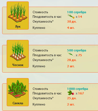 - каждый фрукт и овощ имеет свой срок окупаемости, а также плодовитость, например, лук приносит 14 луковиц в час и окупается за 30 дней;