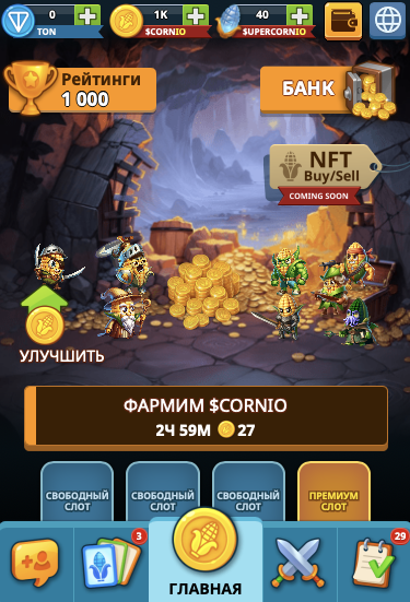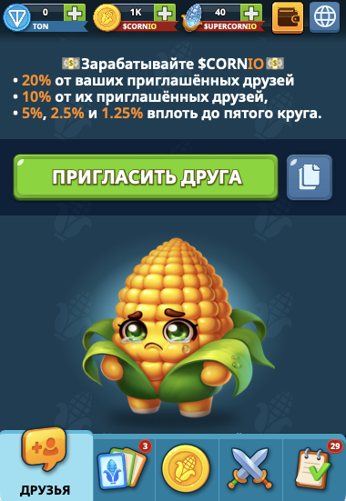 Первое, что нужно знать о том, как играть в Corn Battles – это то, что добыча крипты здесь происходит путем фарминга. Чтобы его запустить, нужно на главном экране нажать на длинную кнопку «Начать фарминг $CORNIO».