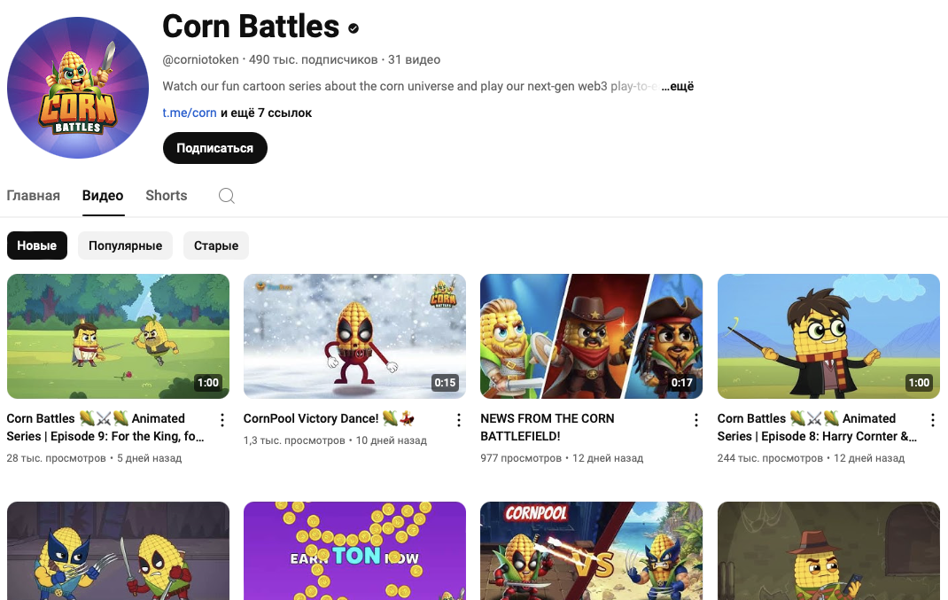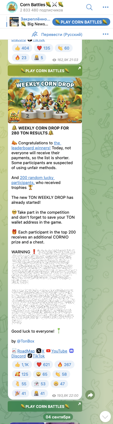 На telegram-канал Corn Battles, на 8 сентября 2024-го года, подписано около 2,8 миллионов пользователей. А публикации в его ленте, в свою очередь, в среднем, просматриваются 150-180 тысяч раз.