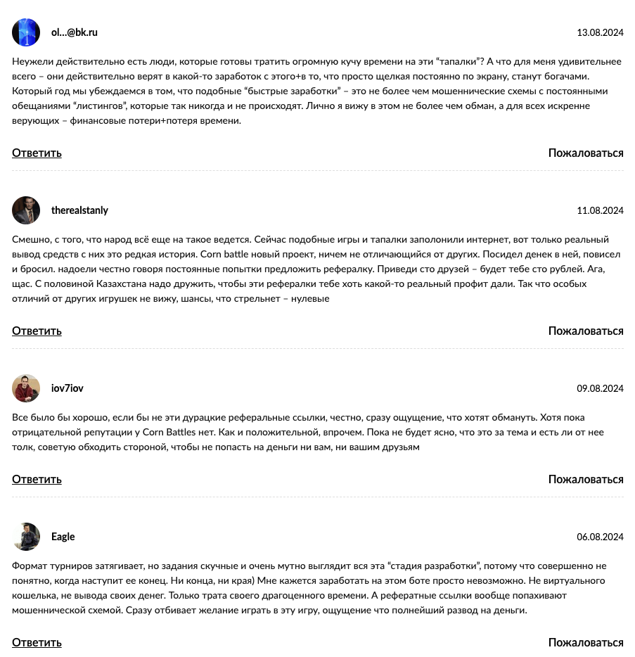 Отзывы об Play Corn Battles в русскоязычном сегменте интернета, преимущественно, являются негативными. Пользователи, как правило, утверждают, что данная игра не способна дать по-настоящему стоящего заработка.