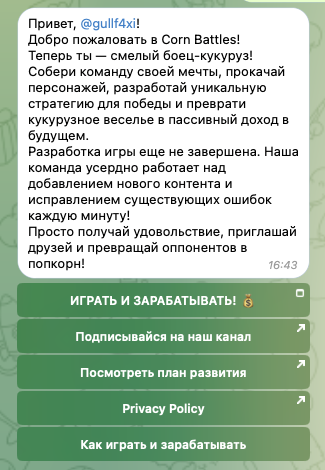 Поэтому перспективы Play Corn Battles, можно сказать, довольно положительные. Также позитивный прогноз подкрепляется еще и тем, что в рассматриваемом приложении уже сейчас есть множество интересных решение. И это выгодно отличает Corn Battles Bot от десятков и сотен похожих по жанру проектов.