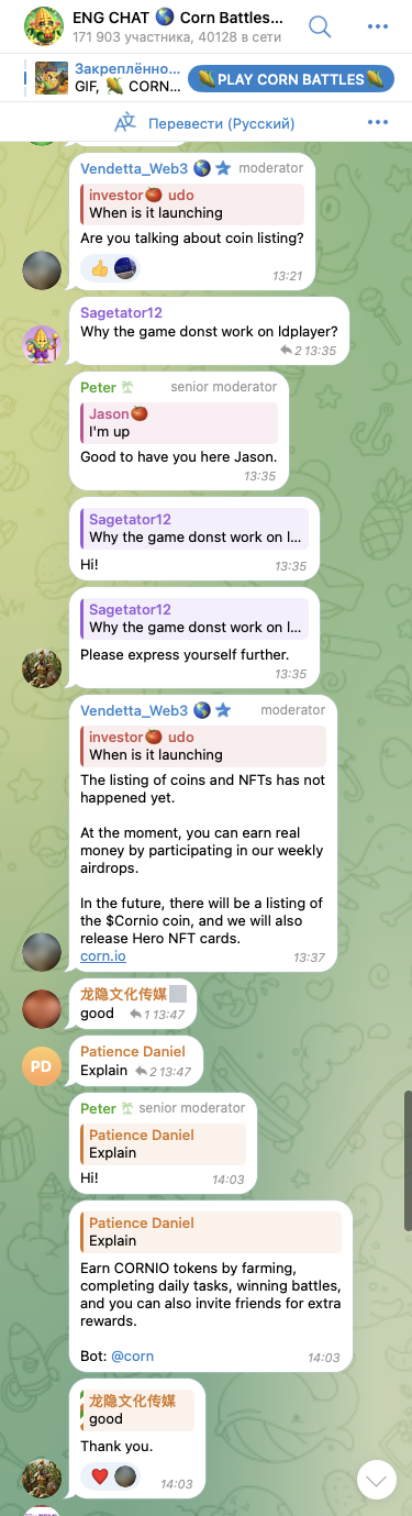 Есть у проекта Corn Battles Online и чат в Telegram. В нем, в свою очередь, состоит около 172 тысяч участников. Общение в нем ведется, преимущественно, на английском языке. А среднее количество сообщений, которое появляется в ленте – несколько сотен штук.