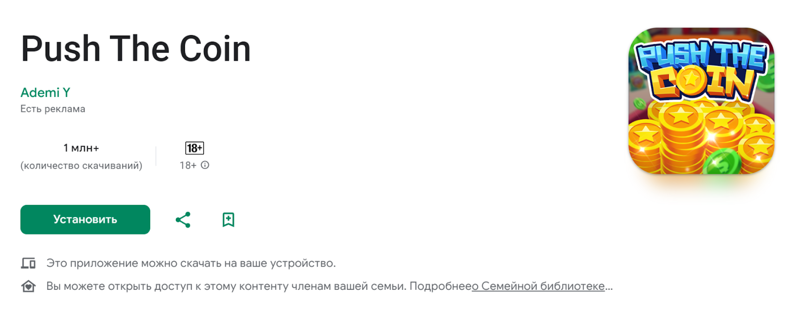 Игра Push The Coin представляет собой софт на Андроид, который доступен для загрузки по ссылке play.google com/store/apps/details?id=com.day.day.good.nice&hl=ru. В описании утверждается, что проект позволяет окунуться в атмосферу Лас-Вегаса. При этом игроки получают шанс заработать реальные деньги.