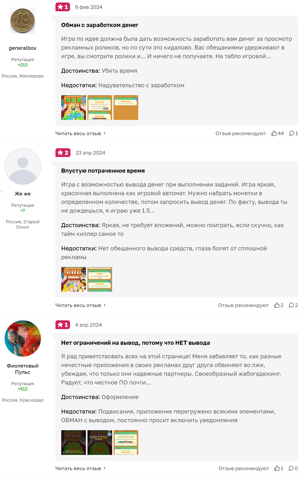 Параллельно игроки отмечают яркое оформление, продуманный и простой интерфейс. Многие просто используют приложение для времяпровождения и не рассчитывают на реальный доход. Главной проблемой является реклама, которая реально отвлекает от игрового процесса и мешает наслаждаться заработком виртуальных монет.
