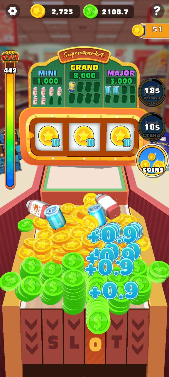 - Встряхнуть. Обеспечивает более быстрое падение монет и ускоряет заработок. Опцию можно активировать раз в 120 секунд.