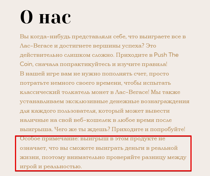 Главной особенностью игры Push The Coin являются обещания получения прибыли. При этом полученные денежные средства якобы можно выводить с помощью разных платежных систем.