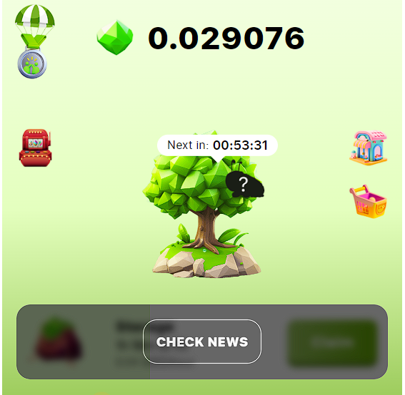 В левой верхней части экрана отображается текущий баланс криптовалюты Seed, в правой – место игрока в общей турнирной таблице. Посередине представлено дерево, которое дает свои «плоды» каждые четыре часа. С него можно получать криптовалюту Seed, внутриигровые предметы, а также усиления.