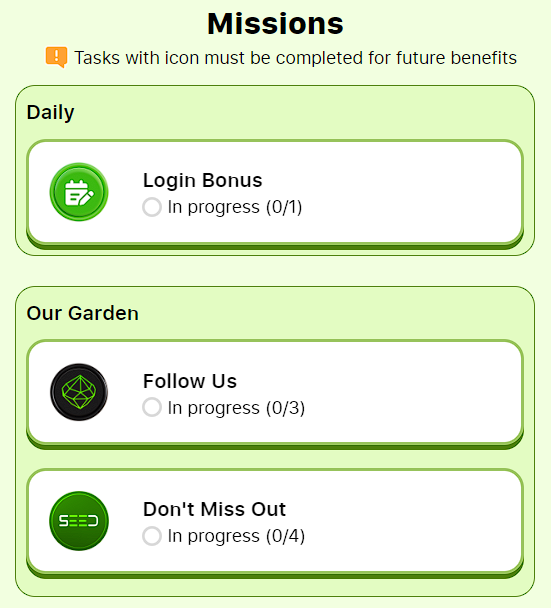 Игра Seed Coin включает пять основных разделов:- Missions. Здесь представлены задания, за выполнение которых предусмотрены выплаты в токенах SEED. Среди них подписки на социальные сети, ежедневный вход в игру и прочие.