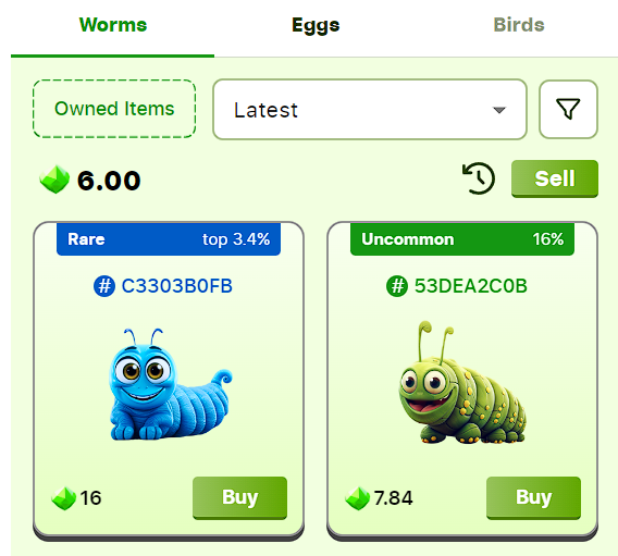 - Inventory. Здесь представлен внутриигровой инвентарь: червяки, яйца и птицы. Последние еще не добавлены в игру Seed Coin. По заявлениям разработчиков, птицы появятся в приложении уже в четвертом квартале 2024 года.