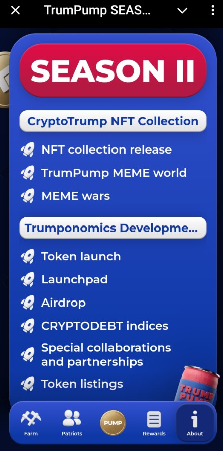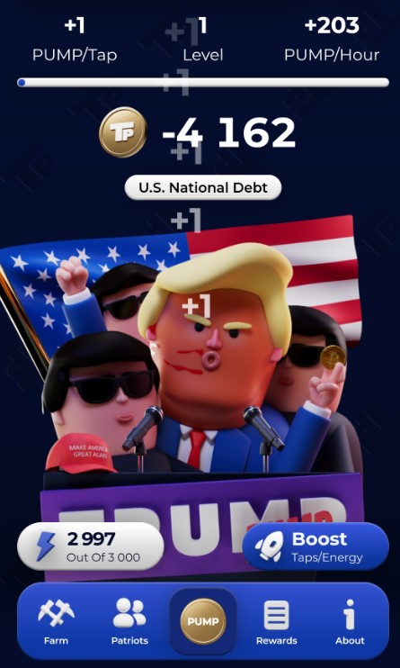 TrumPump — одна из сотен игр-тапалок, появившихся в Телеграме в 2024 году. Не предлагает ничего особенного, громких обещаний или гарантий заработка нет. Отзывы о TrumPump не найдены. У проекта есть типичные для подобных игр минусы:
