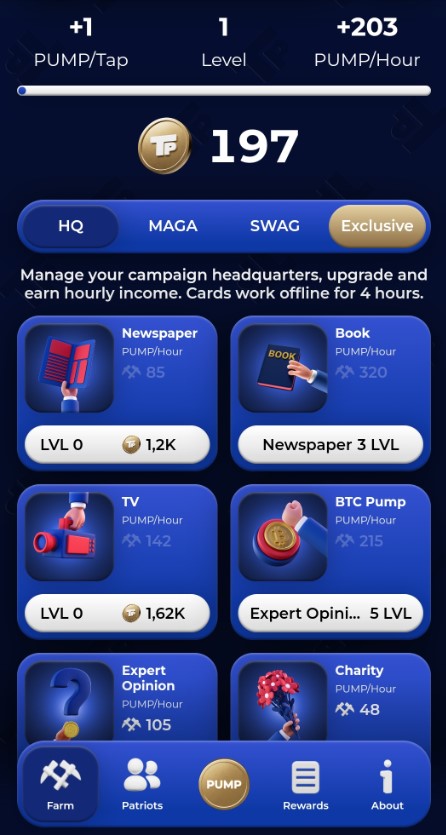 Разобраться в том, как играть в TrumPump, не сложно: игрок запускает приложение и может начинать набирать очки. Система их получения похожа на Hamster Kombat: игрок может тапать по экрану, набирая очки вручную, а может покупать карты и получать их на пассиве. Карточки фармят очки в оффлайне на протяжение 4 часов, после чего игра требует зайти и собрать накопившееся.