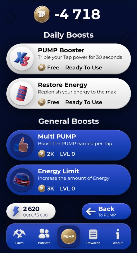 Для получения дополнительных очков можно выполнять задания вроде TrumPump Daily Countersign, покупать бусты. Предусмотрены ежедневные вознаграждения за вход: чем длиннее серия непрерывных входов, тем больше очков получает игрок.