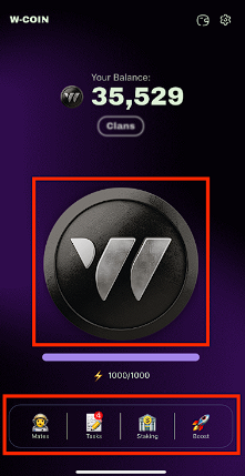 - Как майнить крипту w coin? Здесь все просто, он ничем не отличается от NotCoin, достаточно постоянно нажимать на центральную область приложения.