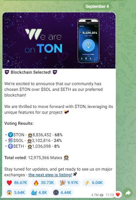 Разработчики не дают конкретной информации, публикации, которые можно заметить чаще всего, это фиксы для приложения, по причине того, что W coin бот не работает. Также это новые достижения, мемы, последние новости, но не листинг.