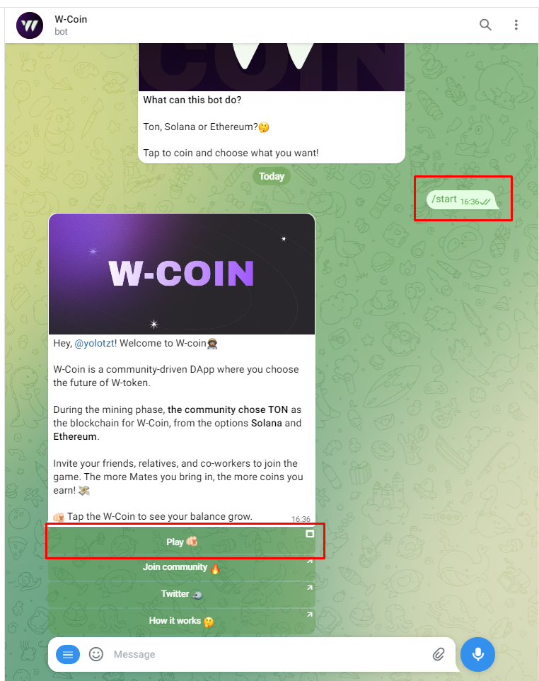 Для начала нам необходимо зайти в telegram wcoin tapbot и отправить начальное сообщение /start.