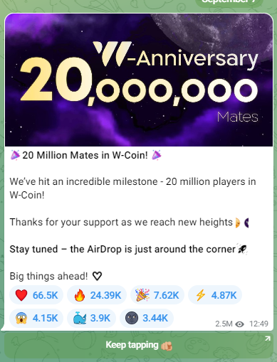 W coin tapbot — это основное приложение и игра, при запуске которой есть ссылка на их основной в коин тг w community где выкладывается главная информация. Аудитория, которую они смогли набрать удивляет — 8,9 миллионов человек, причем охваты публикаций составляют около 65%. Это отличные показатели, но нас смущают закрытые комментарии w coin телеграмм, это явный минус к прозрачности проекта, ведь никакого чата или другого способа коммуникации нет.