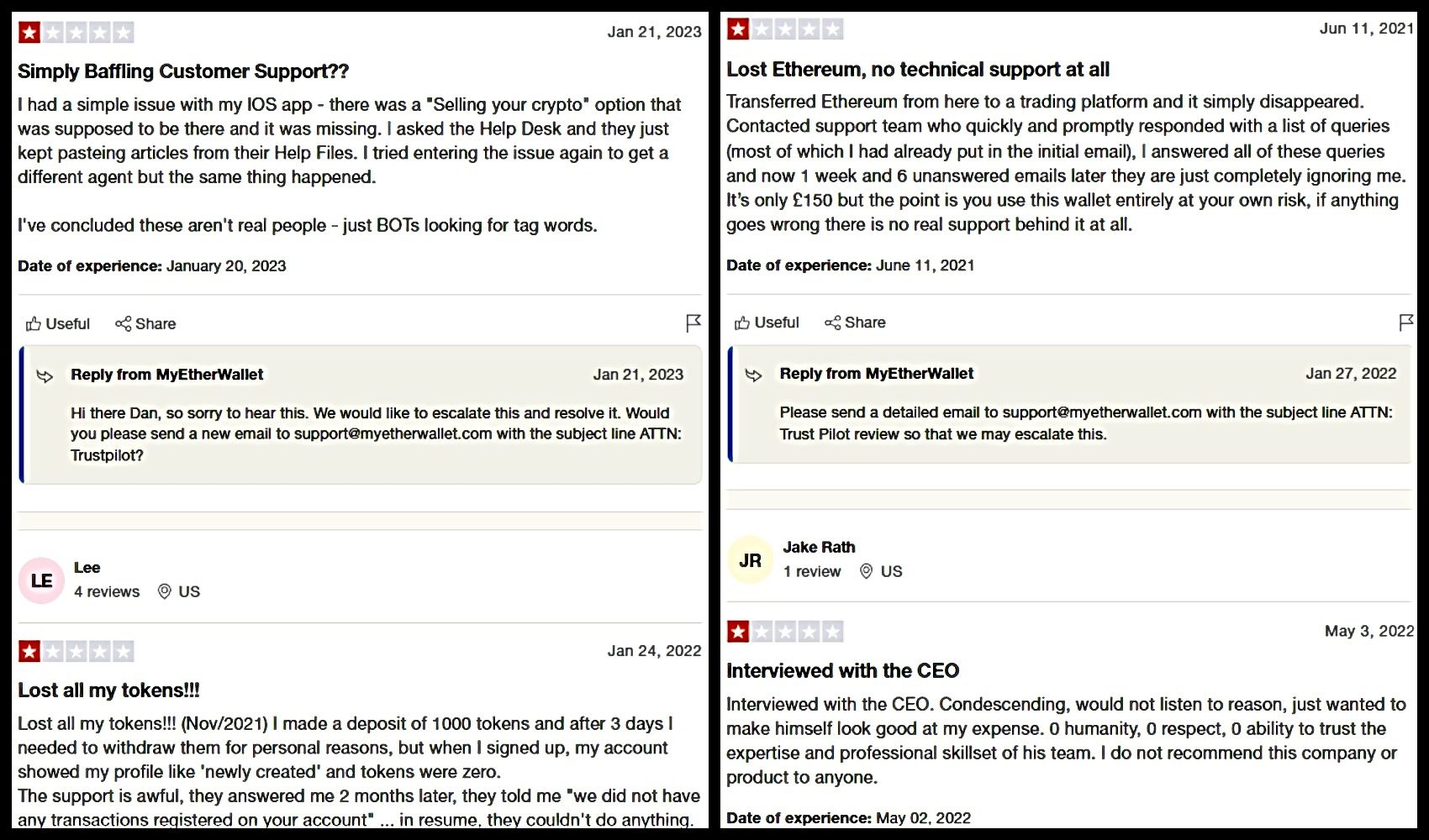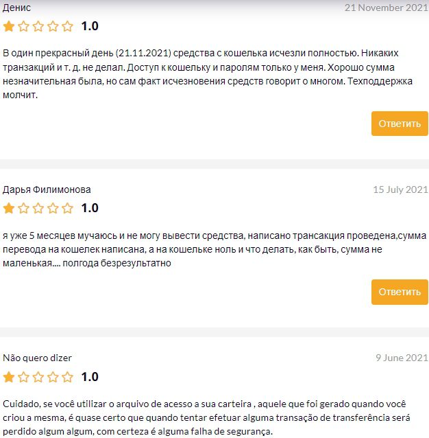Размещенные в стейкинге депозиты также ждет незавидная участь, что доказывают отзывы о MyEtherWallet с TrustPilot. Ряд юзеров вернули часть вложенных в лохотрон средств, что можно списать на случайность или просчет анонимов в реализации мошеннических схем.