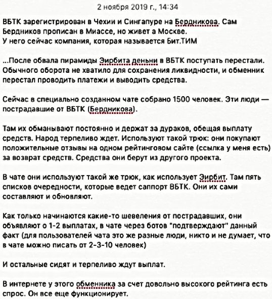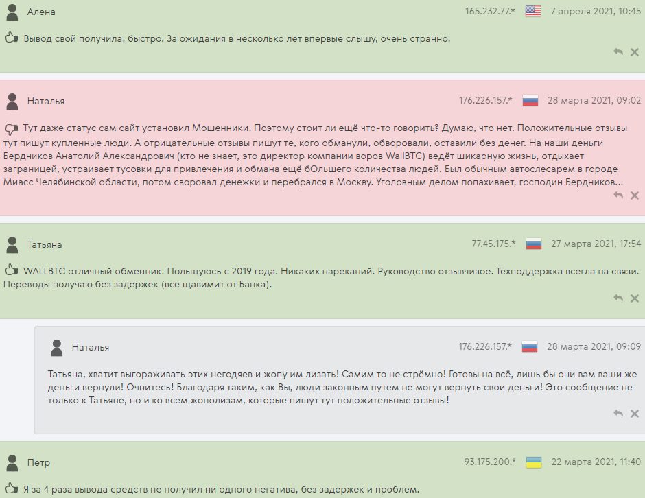 Так, пара отзывов о WallBTC наглядно подтверждают мошенническую суть обменника и прямо указывают на Бердникова как инициатора развода, но в дискуссии с форума негативные реплики тонут в потоке заказных комментов от неустановленных лиц. Именно этот подход в почете у лжетрейдера и подельников, по кругу обманывающих жертв выдумками о «заморозке» вложений в некоем «Европейском банке».