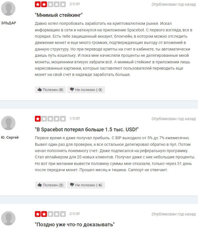 Это не единственная задумка Бердникова и дельцов на подхвате, которые в Telegram зазывают к стейкингу крипты в боте SpaceBOT и опять же на непонятных условиях. Вероятно, именно для этого применяются $SBA и другие липовые активы с сайта обменника Бит Тим, а реальные мнения о «пассивном доходе» нивелируют истории о массе плюсов нелегальной услуги.