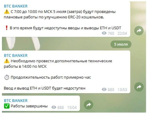 Идея бот БТС Банкер сама по себе понравилась пользователям, даже первоначальная реализация обменника в большинстве случаев устраивала клиентов. Тем более ресурс выставлял конкурентную комиссию за свои услуги. Что произошло внутри проекта, знает только арестованный владелец. Сейчас BTC Banker не функционирует, но до закрытия бота уже было понятно, что проект превратился в скам.
