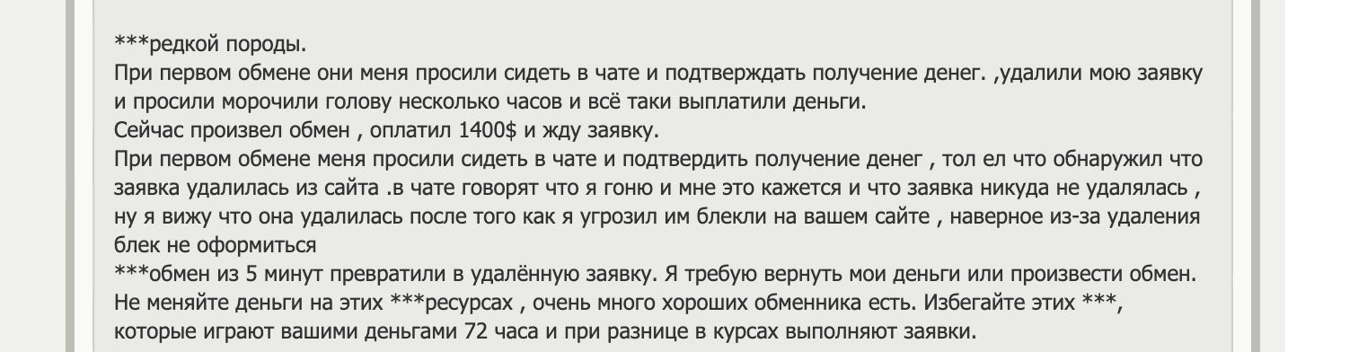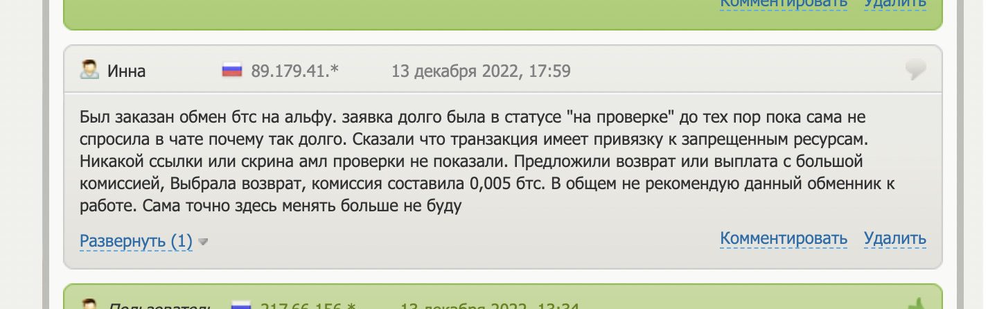 Пользователи жалуются, что обменник отменяет уже оплаченные заявки выше 1000$, ссылаясь на AML. При возврате после отмены заявки сервис вычитает крупную комиссию, до 0,005 BTC.