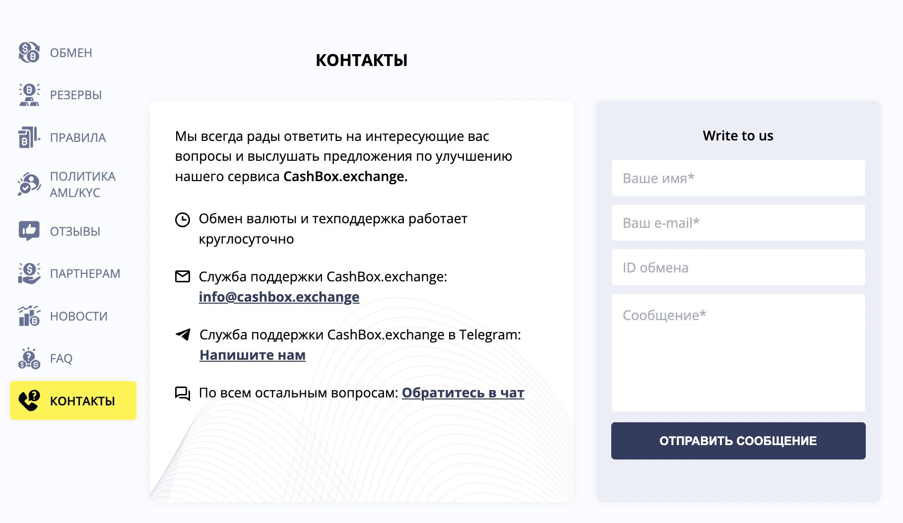 В разделе «Контакты» есть форма обратной связи, электронная почта info@cashbox.exchange, аккаунт в Телеграм @cashbox_ex и онлайн-чат.