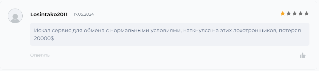Данная платформа занимает почетные места во многих черных списках надежных обменников, которые всячески обманывают пользователей. Многие пользователи жалуются на то, что искали обменник с низкими комиссиями, а найдя этот, они лишь теряли свои деньги. Владельцы не стремятся создать благоприятные условия для обмена, а лишь хотят заработать на доверии клиентов. Также пользователи жалуются на то, что служба поддержки просто бездействует и не отвечает на запросы.