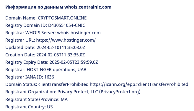 Доменное имя обменника Crypto Smart Online регистратором было выдано только в начале февраля 2024-го года. Это следует из данных сервиса, который запрашивает сведения из базы DNS – Whois.