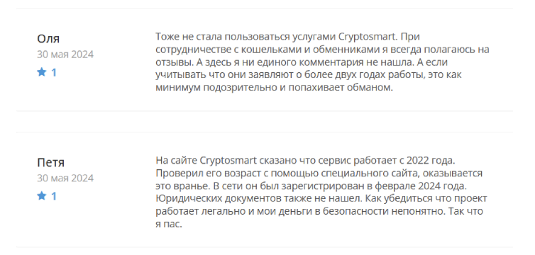 На сайтах, посвященных инвестированию, удается найти несколько отзывов о cryptosmart online, и в них во всех данную платформу называют скамом. В частности, пользователи обращают внимание на несоответствие между заявленным временем работы с 2022-го года и реальной длительностью функционирования.